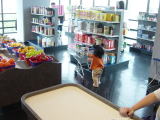 | スーパーがそのまま、すべておもちゃで再現してある場所です。子供サイズのカートを、つっきーはとても気に入りずっと、押していました。カートに買うものを入れる遊びはまだ出来ないようですが、何週も店内を回って大満足の様子でした。 |