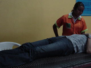 釘って痛そうってママも驚きましたが、手で触ると痛いですが、こうして、横たわり体全体で平均的に釘の力が加わると人間は痛く感じないそうです。本当に驚きました。つっきーは見てただけですが、わからなかったと思います。 |